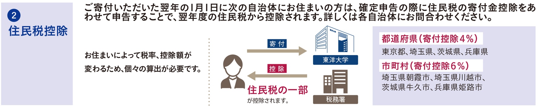 東洋大学へご寄付された翌年1月1日に下記の自治体にお住まいの方は、確定申告の際に住民税の寄付金控除もあわせて申告することにより、 翌年度の住民税から控除されます(2017年にご寄付された場合、2018年度の住民税から控除)。 確定申告をせずに住民税の寄付金控除のみを受ける場合は、自治体に申告してください。寄付金控除の手続